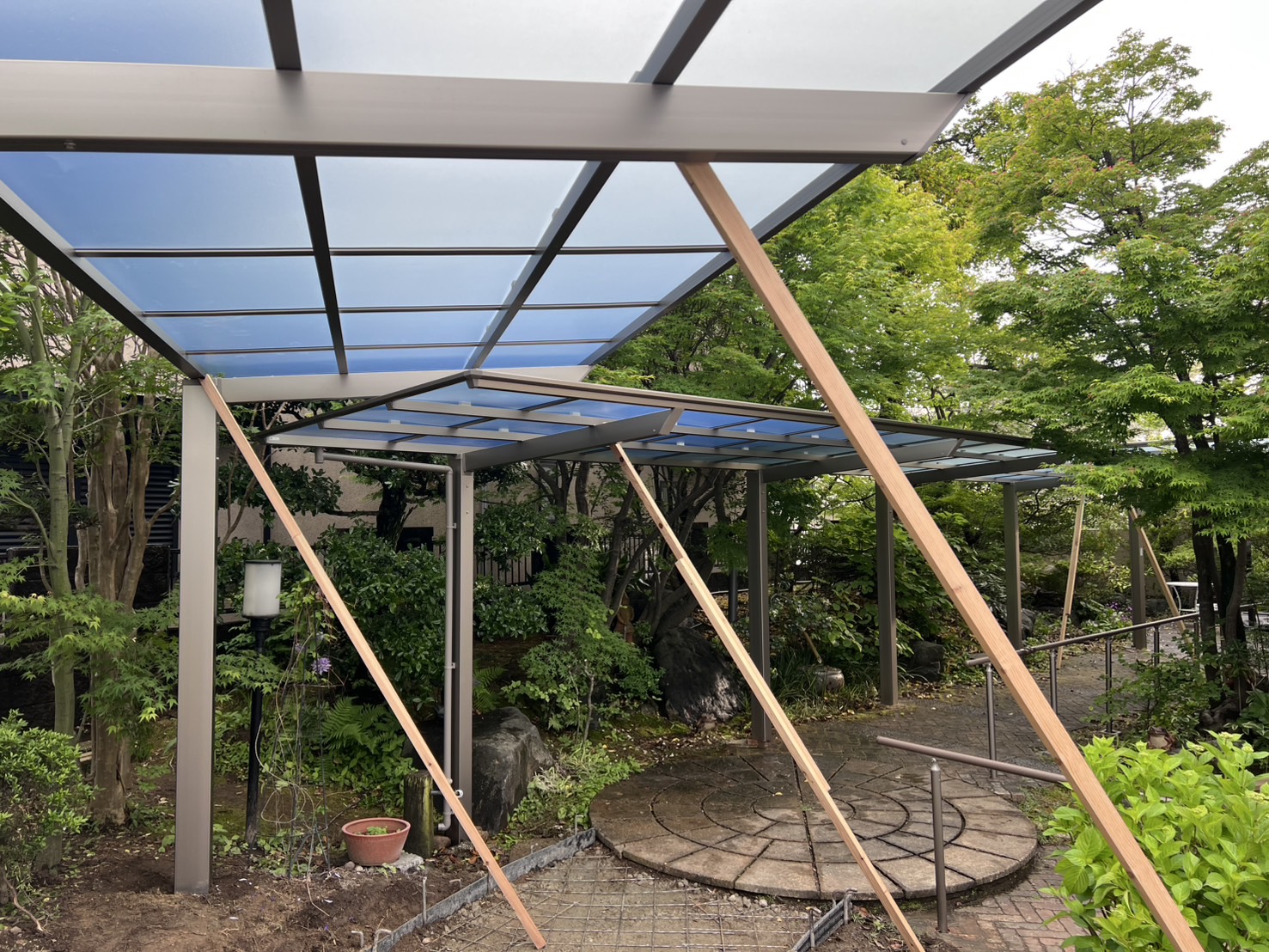 柱を支えるモルタルが固まるまで、倒れないようにしっかりと添え木をしています…🌳